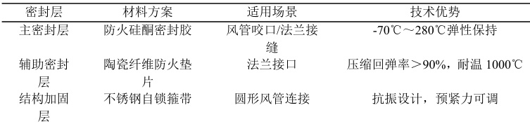风管连接失效的原因包括:接口漏风、高温变形泄露、振动脱落等。工艺应用流程为:(1)材料选择。根据不同密封层选择相应的材料,充分发挥不同材料的优势,见表 3。(2)采用要扣密封五步法进行施工操作,工艺流程为:风管板材折边压槽→涂抹防火密封胶→机械咬合锁紧→外部包覆陶瓷纤维带→不锈钢箍带加固。注意胶层厚度需≥3mm、咬合重叠宽度需 > 15mm。(3)特殊节点处理。穿墙套管密封采用膨胀型防火封堵模块进行套管间隙的填充,风管与套管之间设置柔性石墨密封环,补偿结构变形问题。软连接部位采用双层硅涂玻纤织物软接,软接两端用304 不锈钢喉箍锁紧,喉箍间距 ⩽100mm 。
