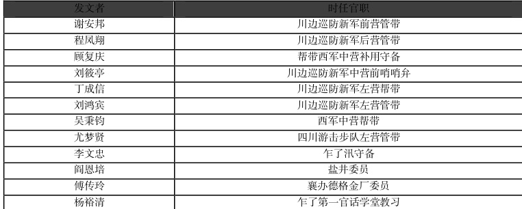 由此看来,“沐恩”确系在军营当中较为普遍使用。《汉语称谓词典》对“沐恩”的解释加上了“军营”的限定词,将其解释为“明清时军官对官长自称”。在《边务档案》当中,使用者的确以军官居多,但似乎还有例外。我们将《边务档案》当中使用过“沐恩”者的职位做了一个统计,见下表: