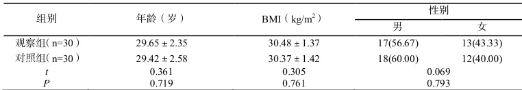 2024 年5 月-2025 年5 月60 例脾虚湿阻型单纯性肥胖患者,将其平均分至各30 例的对照组(常规针刺治疗)和观察组(穴位埋线治疗)。纳入标准: ① 符合单纯性肥胖相关共识[2];②脾虚湿阻型; ③> 18 周岁; ④ 未接受过任何药物治疗者。排除标准:①因激素等因素导致的继发性肥胖者; ② 合并躯体严重性疾病者; ③ 合并出血性疾病倾向者;④埋线穴位周围皮肤溃疡或感染者; ⑤ 动物蛋白过敏者。两组患者一般资料比较,无统计学意义( P>0.05 ),见表1。