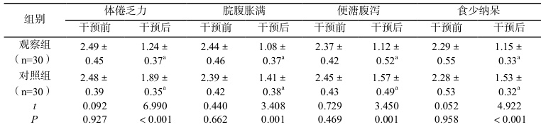 1.3.2 中医证候:制定脾虚湿阻型肥胖患者中医证候评分表[3],包括4 个项目,计0-3 分,分值与症状成反比。