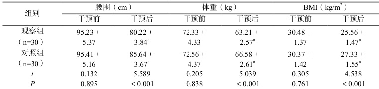 1.3.1 体重控制情况:记录患者干预前后的实际腰围、体重以及BMI 指数。