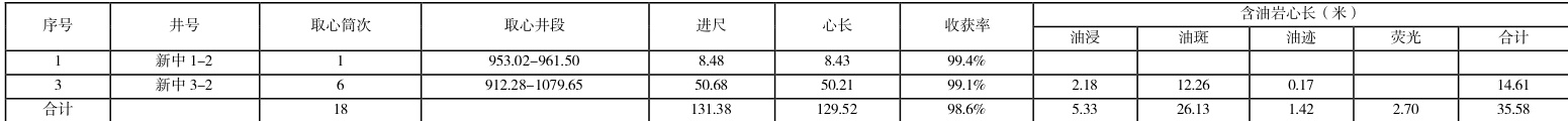 完成钻井取心 18 筒,取心进尺 131.38m,岩心长 129.52m,总收获率 98.6% ,取出含油岩心 35.58m 。见下表