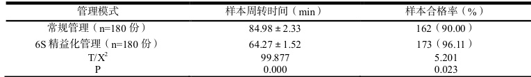 实验室样本周转时间进行统计,在6S 精益化管理模式干预后更短, P<0.05 ;样本合格率中,6S 精益化管理干预后更高, P<0.05AA 详见表1.