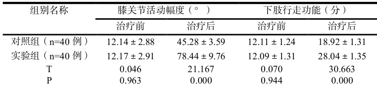 膝关节活动幅度、下肢行走功能比较,治疗前, P>0.05 ;治疗后,实验组较对照组更高, P<0.05AA 。见表 1.