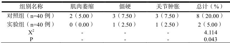 膝关节运动损伤患者并发症发生率比较,实验组低, P<0.05 见表 2.