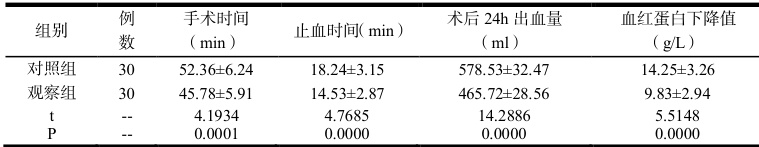 较对照组手术时间及止血时间观察组更短,术后 24h 出血量更低,对血红蛋白指标的影响更小,P<0.05 。详见表 1