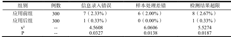 实验室信息管理系统应用后标本处理差错率较应用前明显降低, P<0.05 。详见表