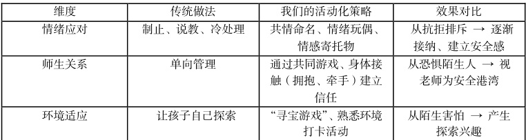 托班幼儿的核心需求是安全感的建立。单纯的安抚和说教收效甚微,我们必须通过活动传递温暖和信任。