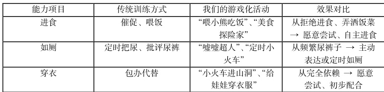 我们的实践:我们将所有生活环节游戏化。我们设计了“喂小熊吃饭”活动:孩子们用勺子给玩具熊“喂”豆子,锻炼手部精细动作和勺子的使用,远比单纯要求他们“好好吃饭”更有效;我们还设计了“小火车进山洞”游戏:学习穿裤子时,我们把裤腿比作“山洞”,小脚是“小火车”,喊着“呜~小火车进山洞啦!”孩子们在欢声笑语中完成了练习;我们还制定了“嘘嘘超人”养成计划: 对于如厕,我们不强求,而是定时组织“集体上厕所”活动,老师在一旁用有趣的口哨声模拟“下雨声”,对成功小便的孩子给予贴纸奖励,封为“嘘嘘超人”,极大地减少了尿裤子的频率。