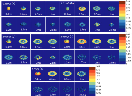 图2 展示了五种液滴初始速度下液滴撞击高温壁面不同时刻的速度场图。在图2(a)中,速度为1.21 m/s 的液滴中心区域轻微隆起但未形成射流结构。至1.2 ms 时接近最大铺展状态,未发生破碎回弹。当速度为 1.71m/s 时,液滴迅速铺展,接触面速度快速降低,而边缘和中心区域仍维持较高速度,速度场呈现环状分布。随后液滴逐渐趋于稳定。速度增至 2.09m/s 时,液滴表现出更强烈的铺展趋势,速度场呈环状扩张。在回缩阶段,速度场逐渐减弱。图2(d)和(e)分别对应撞击速度为 2.42m/s 和 2.70m/s 的情况。液滴铺展更为剧烈,边缘区域容易发生局部破裂,并产生次生小液滴。