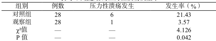 压力性溃疡发生情况进行统计,结果见下表 1 所示: