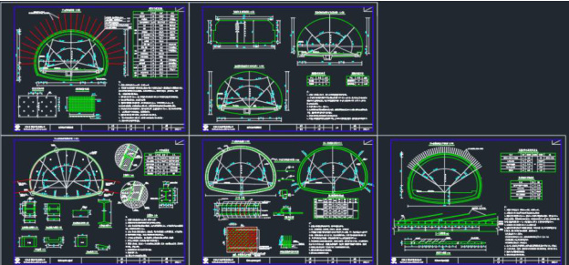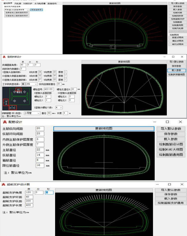 1、衬砌设计模块:包含暗洞衬砌和明洞衬砌两种类型,暗洞衬砌下分单心圆无仰拱、单心圆有仰拱、三心圆无仰拱、三心圆有仰拱、五心圆无仰拱、五心圆有仰拱等六种类型,明洞衬砌下分单心圆、三心圆、五心圆等三种类型,通过参数设置一键生成建筑限界与内轮廓图、衬砌断面设计图、超前支护设计图、钢拱架设计图、衬砌配筋设计图等五种通用性强的设计图,还包括有仰拱直边墙、无仰拱直边墙、竖井等特殊衬砌类型。