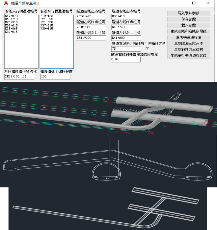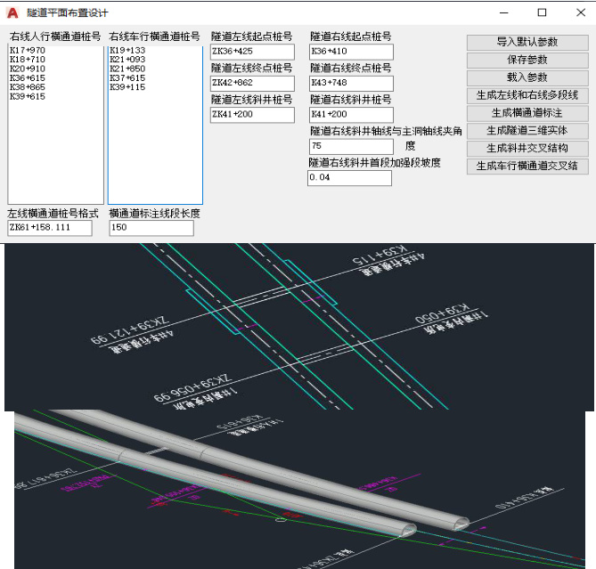 (2)隧道平面布置图设计:输入人行横通道和车行横通道桩号,只需选择选择右线多段线,即可准确定位横通道位置,生成示意线、桩号以及编号等横通道标注图元;输入隧道左右线的起止桩号以及断面衬砌参数文件即可生成隧道三维模型,如图 4 所示为隧道平面布置图设计软件界面及输出成果。