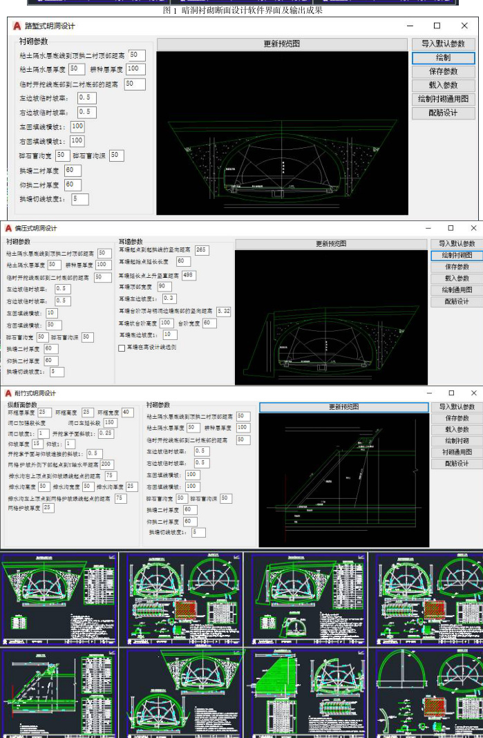 对于不同衬砌类型,系统采用统一用户界面,输入衬砌设计参数后,点击相应按钮即可一键生成建筑限界图、内轮廓图、衬砌断面设计图、超前支护设计图、钢拱架设计图、衬砌配筋设计图。在此以有仰拱三心圆衬砌类型为例,如图1、图2 所示分别为为暗洞和明洞的衬砌断面软件界面及输出成果。