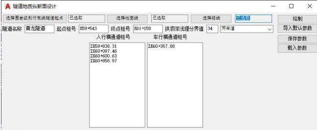 2、平纵断面设计模块:包含隧道平面布置图绘制和纵断面绘制。根据隧道分段围岩地质信息,智能完成隧道的纵断面衬砌类型选用预设计,自动绘制隧道(地质)纵断面设计图及隧道平面布置图(含横通道、紧急停车带),输入隧道起止桩号参数自动生成隧道主洞三维设计模型。