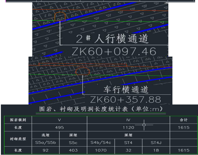 (1)隧道纵断面设计:通过选取已有图纸的围岩级别信息位置,拾取地面线、路线等图元,输入隧洞起止桩号、拱顶深埋分界值、车道类型、人行横通道桩号列表、车行横通道桩号列表等信息,自动生成隧道分段衬砌类型及施工辅助措施、人行横通道和车行横通道标注、围岩级别、衬砌及明洞长度统计表,如图3 所示为隧道纵断面设计软件界面及输出成果。