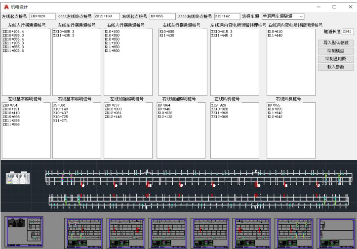 通过输入左右洞起终点桩号,选择车道类型,输入左右线人行横通桩号、车行横通桩号、洞内变电所预留预埋桩号、基本照明桩号、加强照明桩号、风机桩号等必要信息,即可一键生成机电设计图模型视图,然后再生成布局空间的通用图,如图 6 所示机电设计软件界面及输出成果。