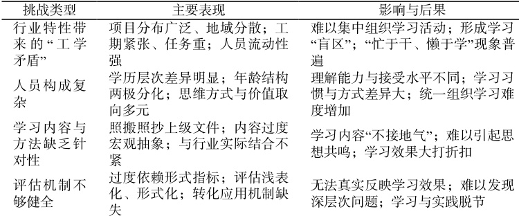 表 1:新时代建筑企业政治思想理论学习面临挑战总结表