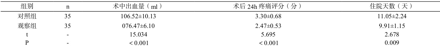 表 1 示,观察组术中出血量、术后 24h疼痛评分更低,住院天数更短,P<0.05, 。