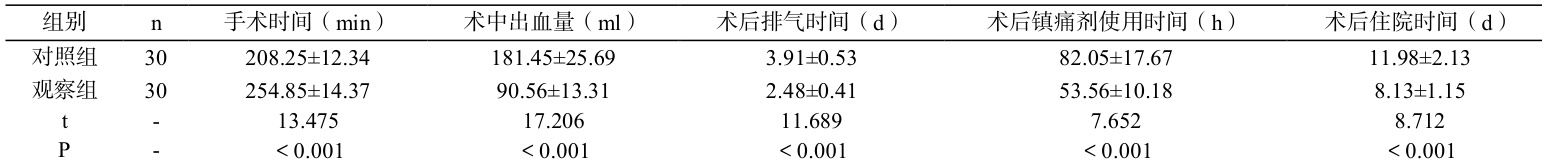 表 1 示,观察组手术时间长于对照组,但其他各项围术期指标数据均优于对照组, P<0.05 。