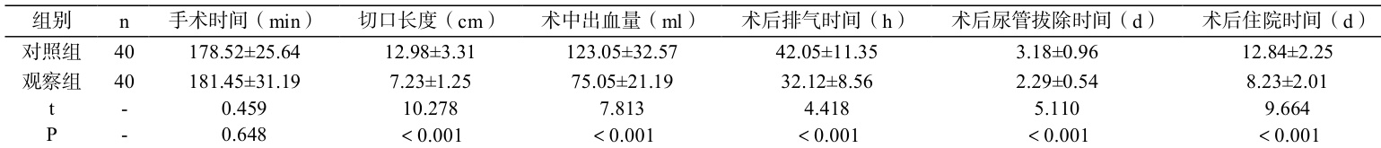 表 1 显示,两组手术时间相比,差异性较小, P>0.05 ,但观察组患者切口长度、术后排气时间、尿管拔除时间、住院时间均短于对照组,同时术中出血量更低, P<0.05 。