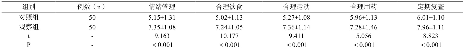 治疗依从性。从情绪管理、合理饮食、合理运动、合理用药、定期复查五个方面进行评价,各方面 0~10 分,得分越高,表示依从性越高。
