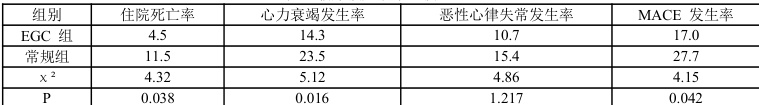 );心力衰竭发生率为 14.3% (16/112),显著低于常规组的 23.5% (24/104),差异有统计学意义( ⋅x2=5.12 , 恶性心律失常发生率为 10.7% (12/112),与常规组的 15.4% (16/104)相比,差异无统计学意义( x2=4.86 P=0.217) 个月随 访结果 EGC 组 MACE 发生率为 17.0% (19/112),低于常规组的 27.7% (29/104),差异有统计学意义 x2=4.15 , P=0.042. )。其中,再发心肌梗死率、心力衰竭再入院率均显著降低(P<0.05),心源性死亡及脑卒中发生率无显著差异(P>0.05,表 2)。
