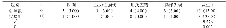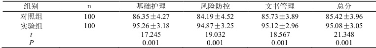 实验组在对照组的基础上加强风险管理,具体包括:(1)构建风险评估体系:应用循证风险评估表,患者入院 2 小时内完成首次评估,包括疾病风险、护理操作风险、环境风险等,根据评估结果将患者分为高、中、低三级风险,并标记为红色、黄色和蓝色标识,制定相应的护理计划。(2)风险干预措施实施:对于高风险患者,应专人专护,每 2 小时巡视一次;中风险患者每日评估风险变化,对护理流程进行优化,跌倒高风险患者加装床栏、使用防滑鞋,压力性损伤高风险患者可使用气垫床,每 2 小时协助患者翻身一次。每月开展风险案例分析会,针对用药差错、护理沟通等典型案例制定相应的改进措施。(3)提升护理人员的能力水平:每季度开展风险管理专项培训,包括风险识别技巧、应急处理流程、循证护理方法等,每月进行急救技能与风险处置模拟演练,并对护理人员进行考核,只有考核合格才能上岗,不断提升护理人员的能力水平和专业素养。(4)动态监测与反馈:建立风险动态监测台账,每日更新患者风险等级与干预效果;每周召开护理质控会,分析风险处理情况,调整干预措施;出院前开展风险管控效果自评,收集患者的反馈意见,随时调整护理方案。