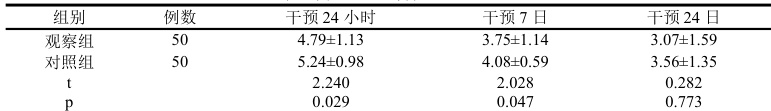 。然而随着时间的推移,观察组的焦虑和抑郁程度均表现出改善。两组对比 SAS 及 SDS,干预7 日,干预24 日,对照组评分均显著高于观察组,显著差异(p<0.05) )。