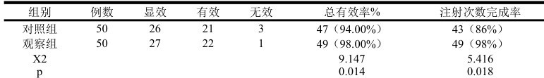 观察组的总有效率为 98% 高于对照组的 94% ,差异显著( ⋅p<0.05) 。在注射次数完成率方面,观察组完成率 98% 优于观察组 86% ,差异显著( (p<0.05) )。
