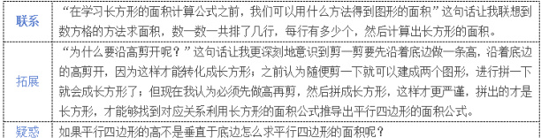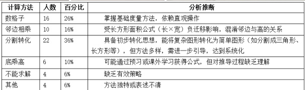 思维起点不一样。大部分学生( 72% )能运用已有的经验(数格子、分割转化)解决问题,但思维层次(直观操作和公式化)和理解深度差别很大。 “邻边相乘” 的错误( 16% )是主要的认识障碍,原因是对面积本质(度量单位的数量)和图形特征(底和高的垂直关系)理解不对。超三分之一的学生有运用“转化”策略的经验,为后面通过剪拼推导公式打下了思维基础。
