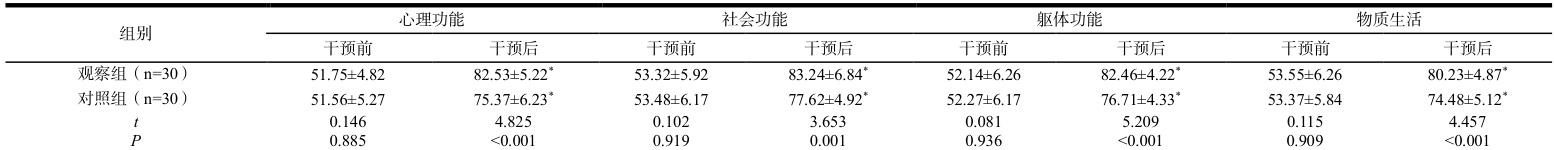 生活质量:两组干预前生活质量无差异( P>0.05 );观察组干预后生活质量评分较对照组高(P<0.05),见表 1。