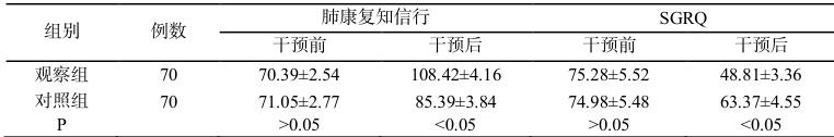一般资料 选取本院 2024 年 1 月至 2024 年 12 月住院治疗的慢性阻塞性肺疾病患者 140 例,随机分为对照组和观察组,各 70 例,观察组中女 22 例,男 48 例;平均年龄(62.14±4.87)岁。对照组中女 25 例,男 45 例;平均年龄(60.75±4.49)岁。两组患者一般资料比较无统计学差异( (γP>0.05) 。纳入标准:(1)符合 COPD 诊断标准的患者;(2)经治疗病情平稳;(3)认知及沟通正常,能够配合研究和随访。排除标准:(1)COPD 急性期患者;(2)合并其他肺部疾病者;(3)有精神异常或认知功障碍者;(4)无法配合研究和随访者,中途退出者。