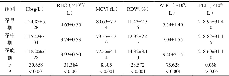 )。孕早期产妇存在较高的 RBC、Hb,较其他组有统计学意义( P<0. 05),详细如表 1 所示。