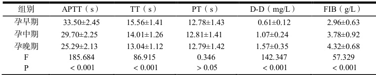 随着孕周增加,FIB、D-D 持续升高,APTT、TT 持续下降( P<0.05) 。三组孕产妇在 PT 方面差异较小( ρ(P>0.05 ),如表 2 所示。