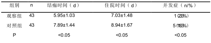 1.4 统计学方法:采用 SPSS 26.0 统计软件包分析数据。结痂时间、住院时间的比较采取 t 检验,并发症发生率的比较以百分比表示,采用 χ2检验,以 P<0.05 为差异有统计学意义。