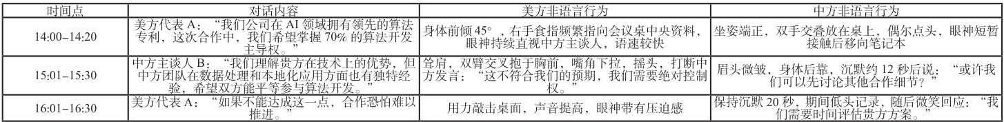 在这个充满活力的商业合作场景中,一家来自美国的领先科技公司与中国的一家知名企业就人工智能技术的未来发展进行了深入的谈判。美方代表在讨论中明确提出了他们希望主导算法开发权的意愿,强调了他们在人工智能领域的技术优势和研发实力。与此同时,中方代表则坚持认为,合作应该建立在技术共享的基础之上,他们认为通过双方的共同努力和知识共享,可以更快地推动技术进步,并且实现双方的共赢。双方在谈判桌上就这些关键问题进行了激烈的讨论,试图找到一个平衡点,以确保合作能够顺利进行,同时满足各自的利益需求。以下便是中美此次谈判过程中非语言行为行为列表:
