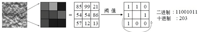 特征提取是人脸识别的核心环节,其目的是从人脸图像中提取出具有判别性的特征向量,以便后续的匹配和识别。LBPH 算法是一种常用的人脸识别算法,其核心特征提取算法是 LBP(Local Binary Pattern,局部二值模式)。LBP 算法的原理是将图像中的每个像素与其相邻像素进行比较,如果相邻像素的灰度值大于等于当前像素的灰度值,则为1,否则为 0 这样就可以将一个像素点周围的 8 个像素点表示成一个 8 位二进制数,称为该像素点的LBP 值。如图2 所示。