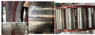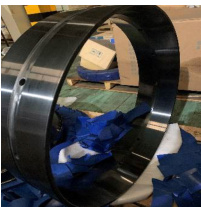 2.1 冶金轧机支撑辊四列圆柱滚子轴承的失效情况介绍在轧机工作辊“咬钢”时产生的瞬间冲击力,通过支撑辊传递给四列圆柱滚子轴承的滚子和外圈滚道,受瞬间冲击力影响,滚子与外圈滚道产生相对滑动,滑动导致外滚道和滚子表面产生“拉毛”现象,这种拉毛现象在应用过程中是不可避免的。例如,某热连轧产线 F7 机架支撑辊轴承在运行 2000 小时后,下机解体后发现此现象,轴承外滚道负荷区出现“拉毛”现象,滚动体表面有轻微“拉毛”现象,内圈滚道良好,见图一。