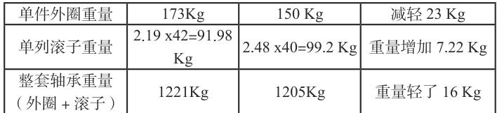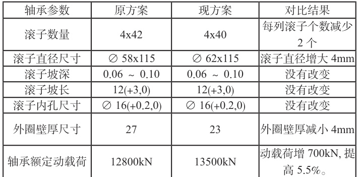 从上表上看,轴承承载能力提高了 700kN , 提高 5.5% ,轴承寿命提高了 20% ,且轴承总体重量减轻了16kg,降低了成本,增强市场的竞争力。