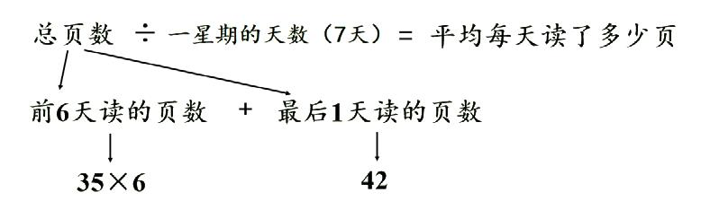 新课标倡导的数学语言表达,本质是培养小学生用简洁符号、直观图表描述数量关系的能力。教学中可设计画线段图分析应用题、用流程图梳理解题步骤等活动,例如,在“平均数”教学中,我引导学生通过画流程图 + 分析法来梳理解题步骤,原题:“文文一星期读完了一本故事书,她前 6 天平均每天读 35 页,最后 1 天读了 42 页。这个星期平均每天读多少页?”思路分析:要求一个星期平均每天读多少页,就要先求出这个星期一共读了多少页。