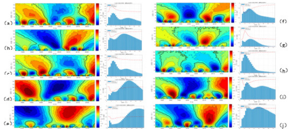 图中 3(a)(b)(c)(d)(e)表示年和各个季节降水量的小波系数和小波方差柱状图。图中信号的强弱通过小波系数的大小来表示,等值线为正的用红色表示,代表降水偏多;等值线为负的用蓝色表示,代表降水偏少。对于年降水量存在两个显著周期,第一显著周期为3 年,第二周期为 8\~10 年,到 2024 年红色等值线还未出现闭合,说明未来一段时间内年总降水量将会偏多。对于春季总降水量而言,存在2 年和 8年的显著周期;夏季总降水量存在 3 年和 8\~10 年的显著周期;秋季总降水量存在 3 年和 10 年的显著周期;冬季总降水量存在 1 年和 12\~14年的显著周期。其中夏季和冬季的红色等值线未出现闭合,意味着未来一段时间内夏季和冬季的降水量将会偏多,春季和秋季的蓝色等值线未出现闭合,意味着春季和秋季的降水量在未来一段时间内降水量将会偏小。