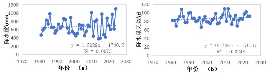 选取沈阳市沈北新区气象站 1981 年至 2024 年的逐日降水资料,按照气象观测标准对日降水量达到 ⩾0.1mm 进行统计。将春季定义为3\~5 月,夏季定义为 6\~8 月,秋季定义为 9\~11 月,冬季定义为 12 月 \~次年2 月。