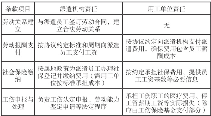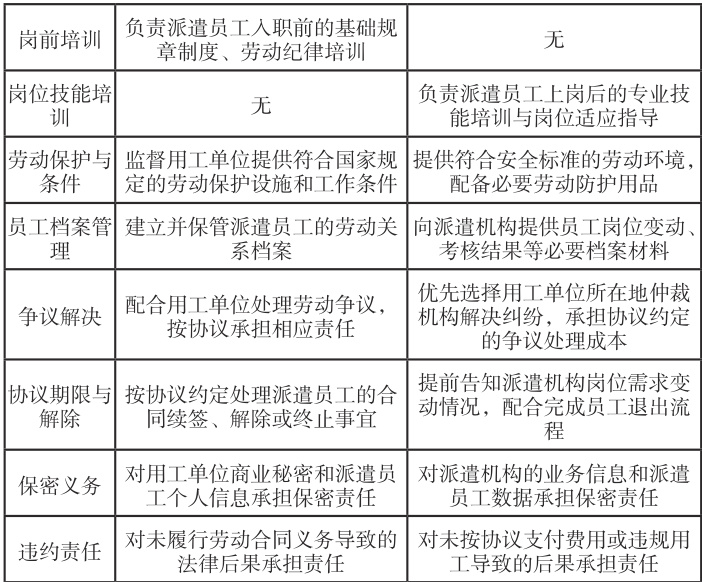 制定包含12 项核心条款的协议模板(见表1),明确双方责任边界。表1 劳务派遣协议核心条款