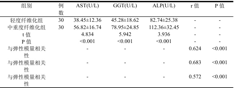 肝酶谱与弹性模量相关性检测:测定血清谷草转氨酶(AST)、 γ⋅ 谷氨酰转肽酶(GGT)、碱性磷酸酶(ALP)水平,分析各项肝酶指标在不同纤维化组别间的差异,并计算其与肝脏弹性模量值的Pearson 相关系数(r 值)。