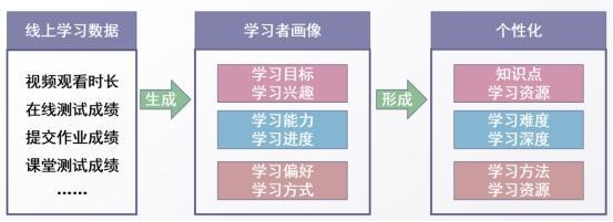 通过关注学生线上视频观看时长、在线测试成绩、提交作业成绩、课堂测试成绩等学习记录数据,分析其对各个知识点及相关内容的掌握程度,形成“学习者画像”,进而给出个性化学习指导。