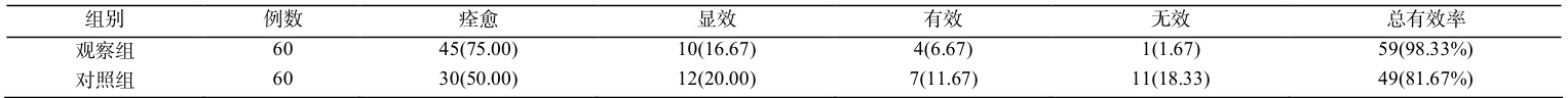 如表 1 所示,观察组总有效率显著高于对照组 ⋅P<0.05 )。