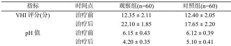 治疗前,两组 VHI 评分和 pH 值比较无差异( P>0.05 )。治疗后,两组 VHI 评分均显著升高,pH 值均显著下降,且观察组的改善幅度均显著大于对照组( P<0.05 )。见表 2。