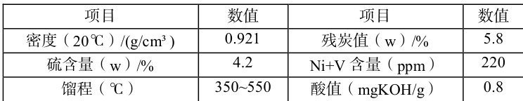 原料油:某炼油厂常减压渣油(性质见表 1),硫含量 4.2% (w),Ni+V 220ppm (w),残炭值 5.8% (w),酸值 0.8mgKOH/g 。