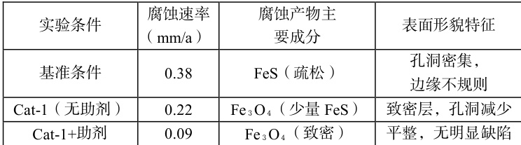 基准条件下(Cat-0,无缓蚀剂),Q235B 钢的腐蚀速率为 0.38mm/a (电化学测试);优化后(Cat-1+助剂),腐蚀速率降至 0.09mm/a ,降幅 76% 。SEM-EDS 分析显示,基准条件下腐蚀产物主要为 FeS( Fe:58.2%,S:3 2.7% ),表面疏松多孔;优化条件下产物为致密的 Fe3O4 ( Fe:72.4%,0:25 .1% ),无明显 S 富集。